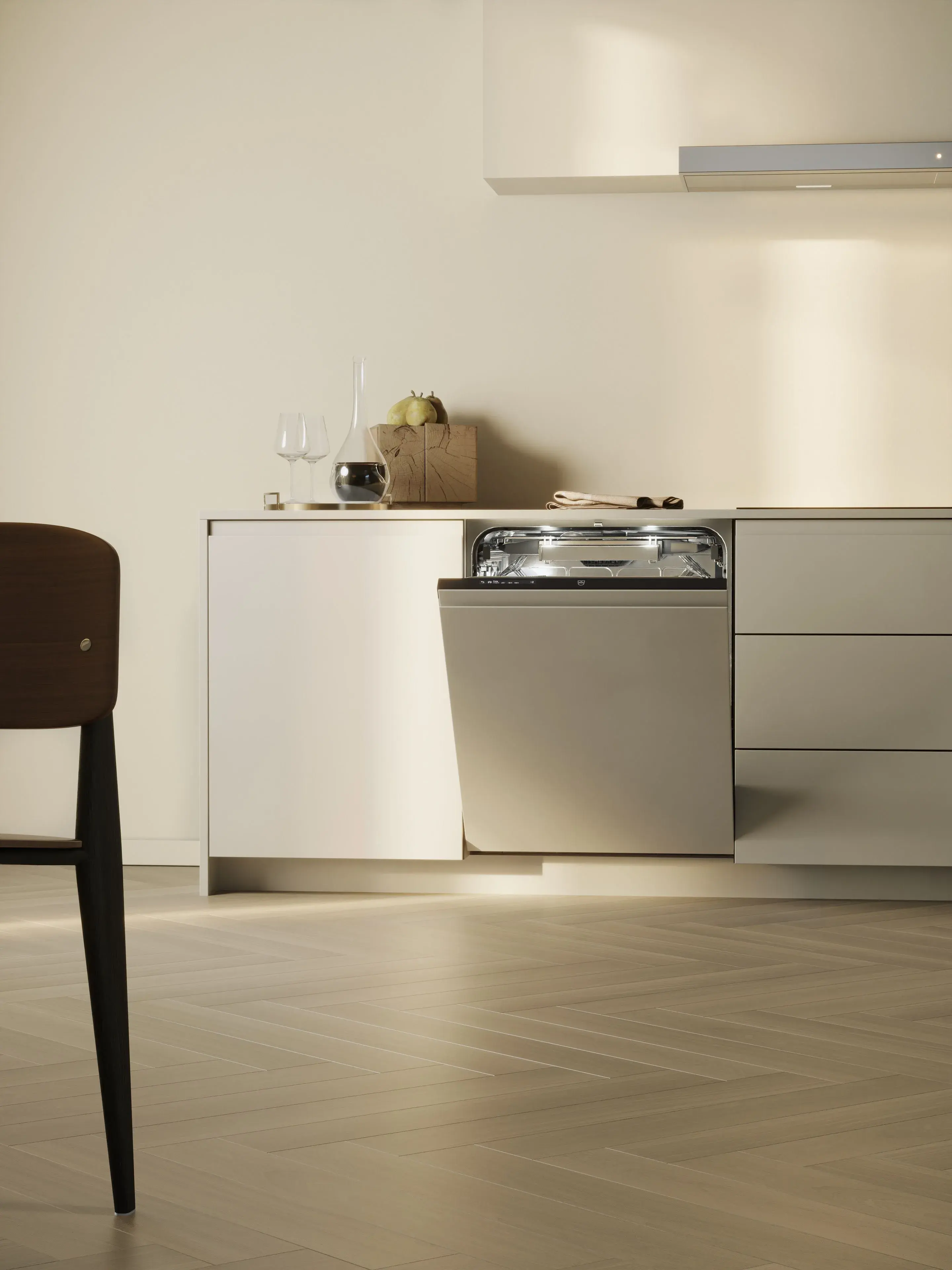 Die Adora Geschirrspüler bringen die elegante, minimalistische Ästhetik von V-ZUG und den Fokus auf hochwertige Materialien zum Ausdruck. Der neue Innenraum überzeugt mit eleganten Geschirrkörben in Silbermetallic sowie SoftSlide und SoftClose für ein hochwertiges Erlebnis. Die neu gestalteten Auszugsschienen sorgen für eine sanfte Gleitbewegung, um empfindliche Gläser beim Einschieben und Herausziehen der Körbe zu schützen. Die LED-Beleuchtung erhellt perfekt den geräumigen Innenraum: