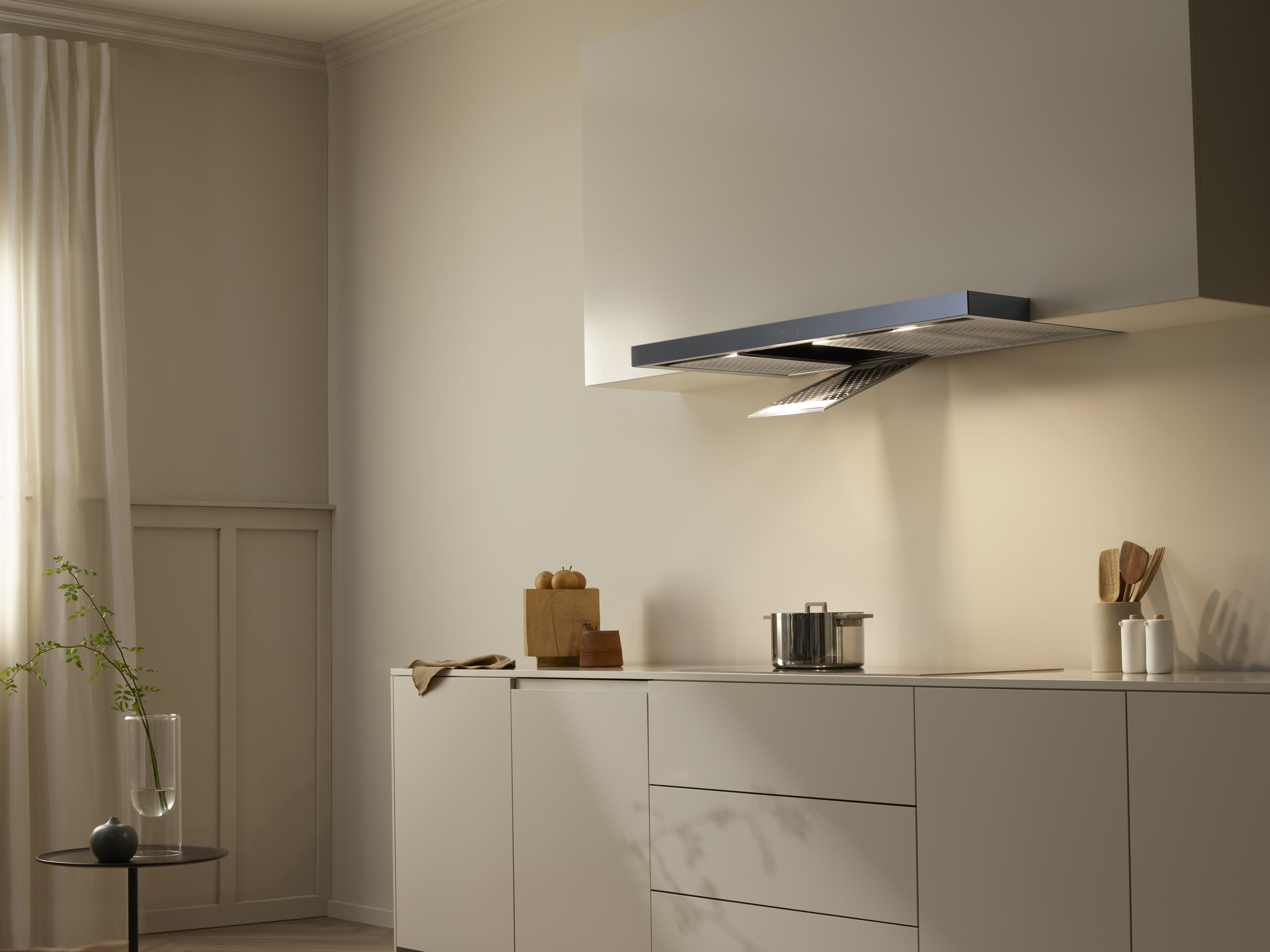 Die Abzugshauben von V-ZUG sind leistungsstark und intelligent. Für einen sorgsamen Umgang mit der Energie wird die Abzugsleistung durch Automatikfunktionen gesteuert. Obwohl sie besonders leistungsstark sind, bleiben die Abzüge selbst auf höchster Stufe erfreulich geräuscharm.